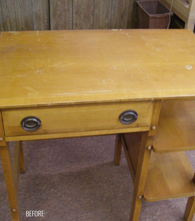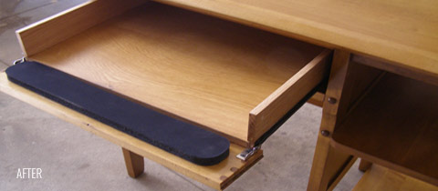 *on the photos above, in addition to retouching the desk to remove scratches, we moved the shelf to accommodate a computer tower and modified the drawer to flip open for keyboard use and added a wrist pad.